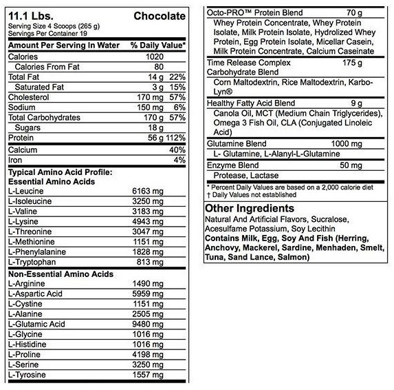 Склад (інгредієнти): протеїнова суміш Octo-PRO™ Protein Blend (з молока):( концентрат сироваткового протеїну, ізолят сироваткового протеїну, ізолят молочного білка, гідролізований сироватковий протеїн, міцелярний казеїн, концентрат молочного білка, казеїнат кальцію), ізолят яєчного білка; кукурудзяний мальтодекстрин, рисовий мальтодекстрин, рапсова олія, MCT, омега-3 риб’ячий жир, CLA, L-глютамін, L-аланіл-L-глутамін, Enzyme Blend: протеаза, лактаза; натуральні та штучні ароматизатори, сукралоза, ацесульфам калію, соєвий лецитин.