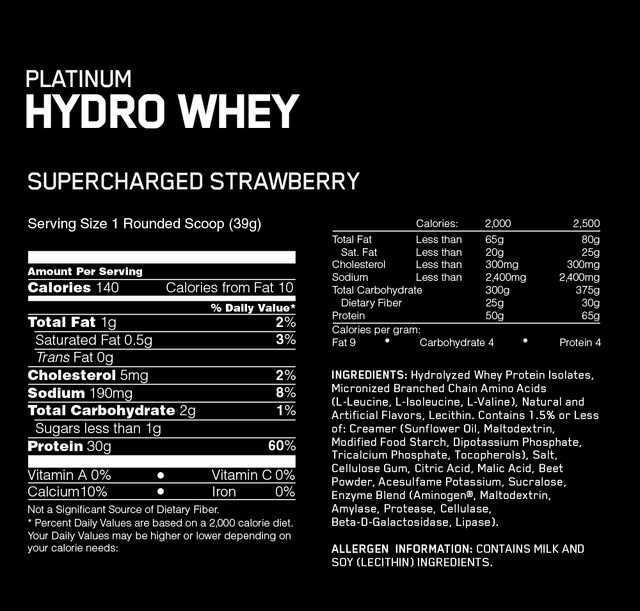 У гідролізаті ізоляту сироваткового протеїну Platinum Hydrowhey представлена нова система травних ензимів і мікронізованих амінокислот із розгалуженими ланцюжками BCAA. Продукт створений виключно з гідролізованих ізолятів сироваткового протеїну, білок пройшов процес подрібнення на маленькі частини — пептиди та містить ді-, три- та оліго-пептидні зв'язки білка, що прискорює їх засвоєння нашим організмом і доставляє їх прямо до м'язових тканин, у ньому немає зайвих жирів, цукру, холестерину та лактози.